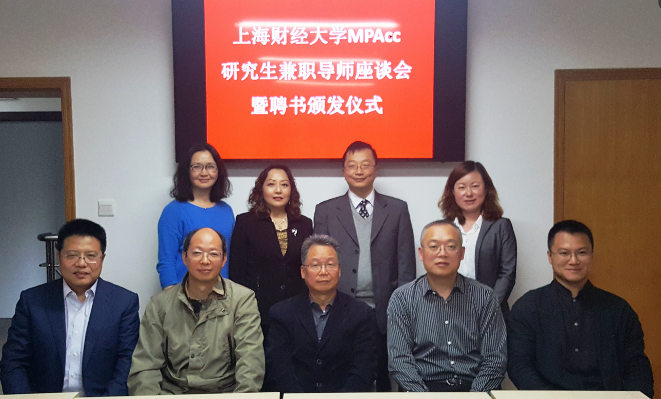 2016年4月23日下午,上海财经大学MPAcc研究生兼职导师座谈会暨聘书颁发仪式在MPAcc中心会议室顺利召开。会计学院副院长朱凯教授、院长助理兼MPAcc中心主任张纯教授,上海世博局发展集团监事会主席吴云飞、上海市财政局会计处副处长乔元芳、上海银行总行财务总经理王景斌、新华医院副院长程明、月星集团副总裁顾春峰等导师拨冗出席了会议。