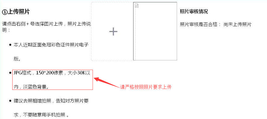 注意:务必确保上传的本人近期正面免冠彩色照片的尺寸为150×200像素,不合规定的照片将会被系统自动压缩或审核不合格。