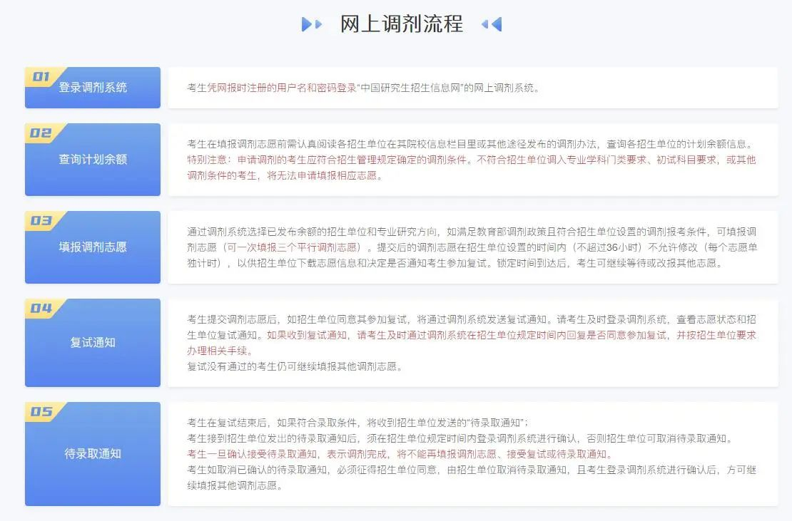 3. 调剂计划余额:考生在填报调剂志愿前需认真阅读各招生单位在其院校信息栏目里或其他途径发布的调剂办法,查询各招生单位的计划余额信息。特别注意:申请调剂的考生应符合招生管理规定确定的调剂条件。不符合招生单位调入专业学科门类要求、初试科目要求,或其他调剂条件的考生,将无法申请填报相应志愿。