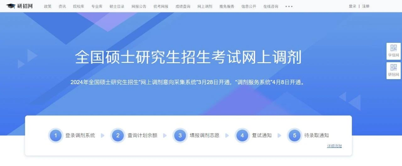 考生凭网报时注册的用户名和密码登录“中国研究生招生信息网”(网址:https://yz.chsi.com.cn)的网上调剂系统。