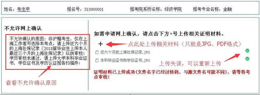 对于不允许确认的考生,请根据系统提示,上传有关证明材料。其中非应届本科毕业生须同时上传以下材料之一的扫描件: