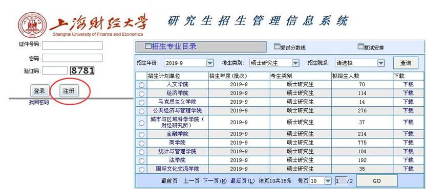 报考上海财经大学,且网上报名选择“3109上海财经大学”报考点的考生,登录上海财经大学研究生招生管理信息系统(建议使用IE、Chrome 、Firefox浏览器),点击注册。以网报阶段生成的报名号(首4位数字是3109)作为证件号码进行注册。