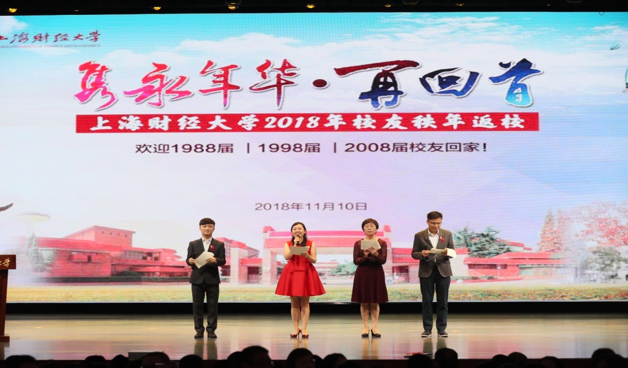 2018年11月10日,“隽永年华·再回首”上海财经大学2018年校友秩年返校活动于国定路艺术中心隆重举行。上海财经大学会计学院MPAcc 2006级(2008届)90余位校友从全国各地不远千里齐聚母校,共庆母校101周年华诞。重逢欢聚的喜悦给上财增添了一抹别样的温情。大合影留念后,2018年秩年返校大会隆重开幕,蒋玲校友作为主持人之一闪亮登场,会计学院MPAcc2006级1班表演诗朗诵《我的南方和北方》,校友们通过优美的诗句诉说着大江南北的中华儿女对祖国深深的热爱和眷念,隽永年华再回首,不悔情真,不负师恩,上财儿女虽来自大江南北,腾飞于五湖四海,但母校永远是他们内心深处牵挂的家园。