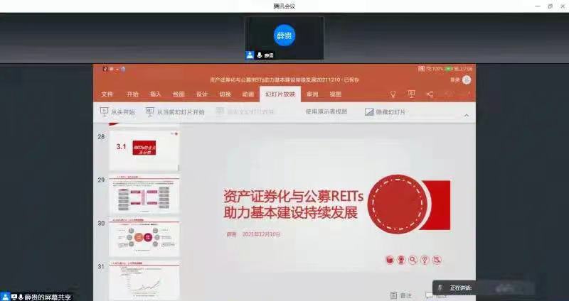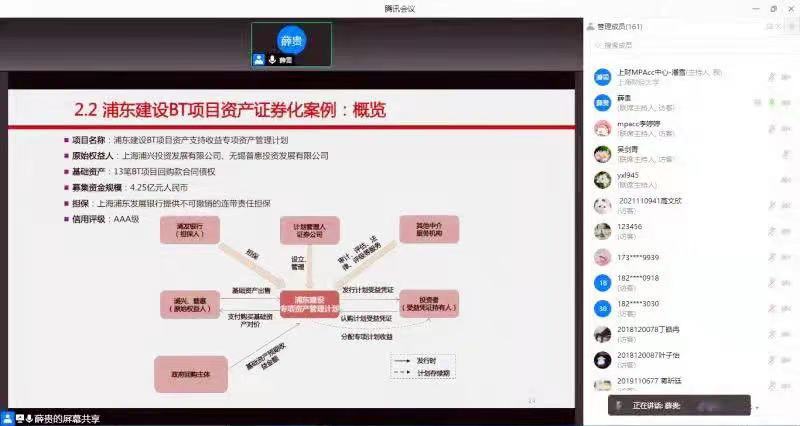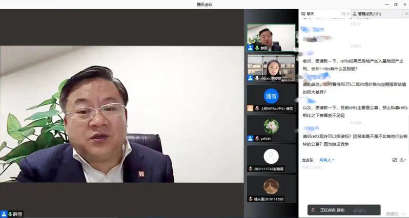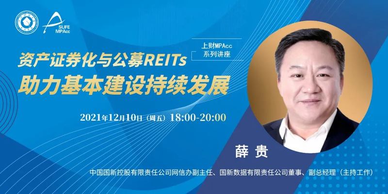 2021年12月10日,上海财经大学MPAcc系列讲座在我校成功举办,中国国新控股有限责任公司网信办副主任,国新数据有限责任公司董事、副总经理,上海财经大学MPAcc职业导师薛贵以“资产证券化与公募REITs助力基本建设持续发展”为主题,为我校160余位师生带来了精彩的线上分享。